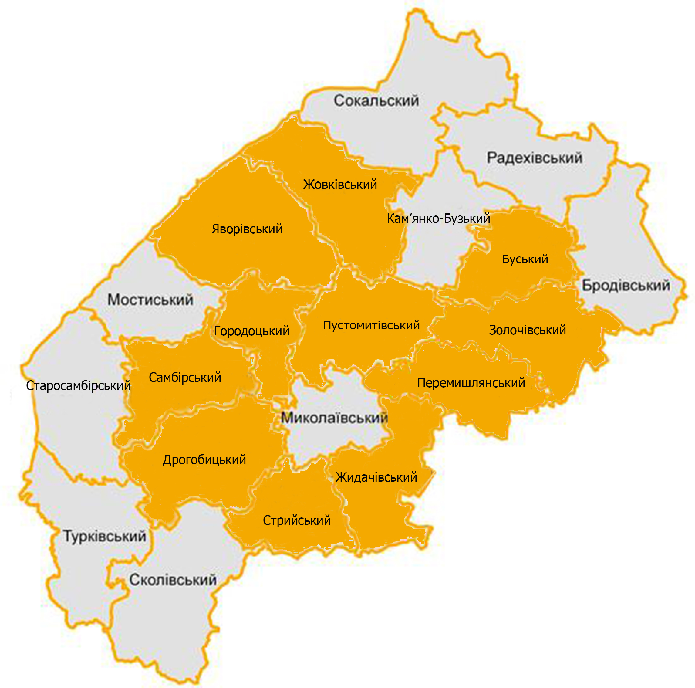 Буського, Золочівського, Городоцького, Пустомитівського, Перемишлянського, Жидачівського, Яворівського, Самбірського, Дрогобицького, Стрийського, Жовківського районів Львівської області. |