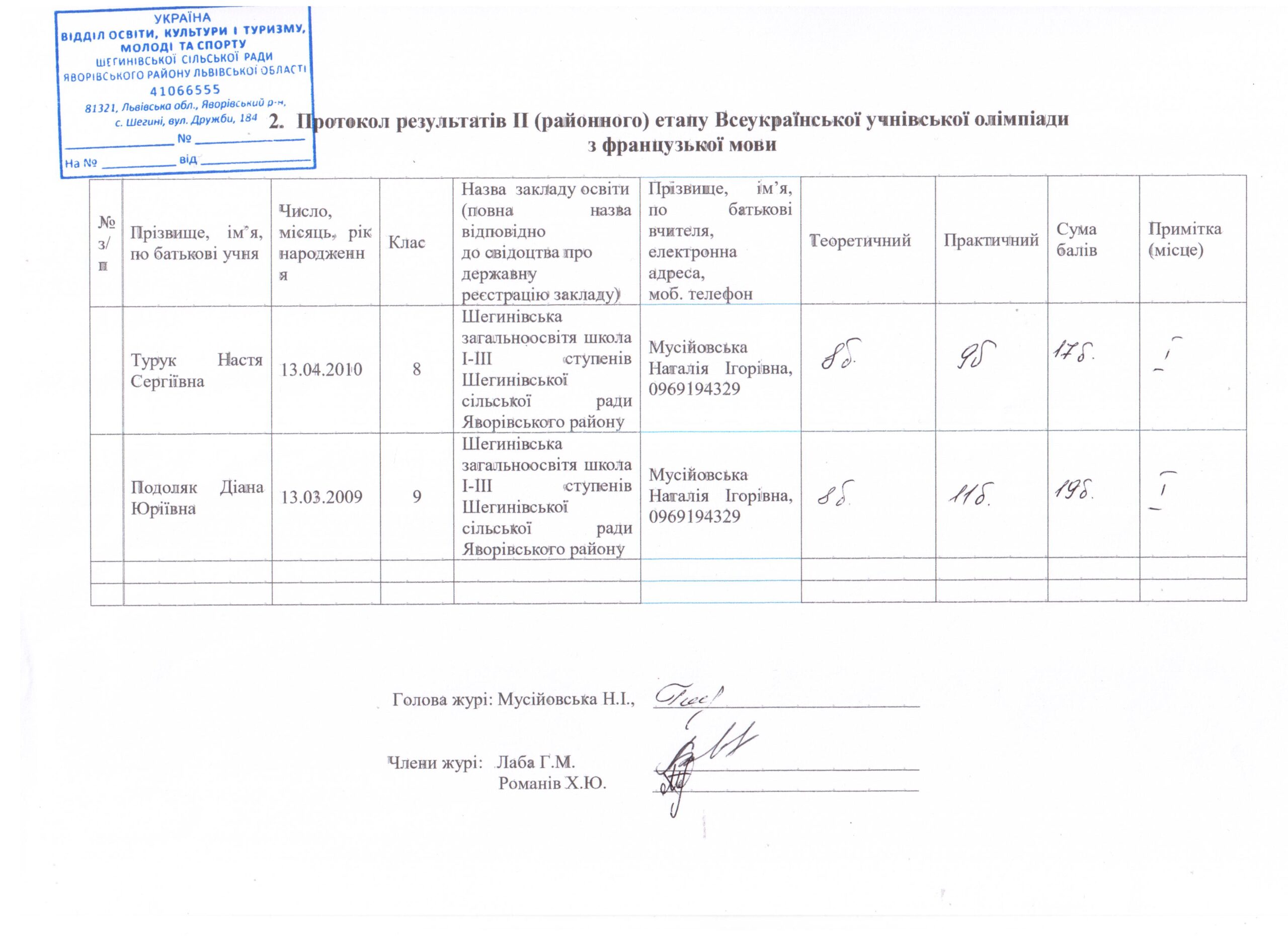 1. Турук Настя Сергіївна, учениця 8 класу Шегинівської загальноосвітьої школи І-ІІІ ступенів Шегинівської сільської ради (вчитель Мусійовська Н.І.).