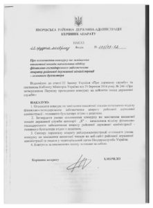 - Наказ Яворівської районної державної адміністрації від 23 грудня 2019 року № 171 /03-32 про оголошення конкурсу на заміщення вакантної посади категорії „Б” – начальника відділу фінансово-господарського забезпечення апарату районної державної адміністрації – головного бухгалтера