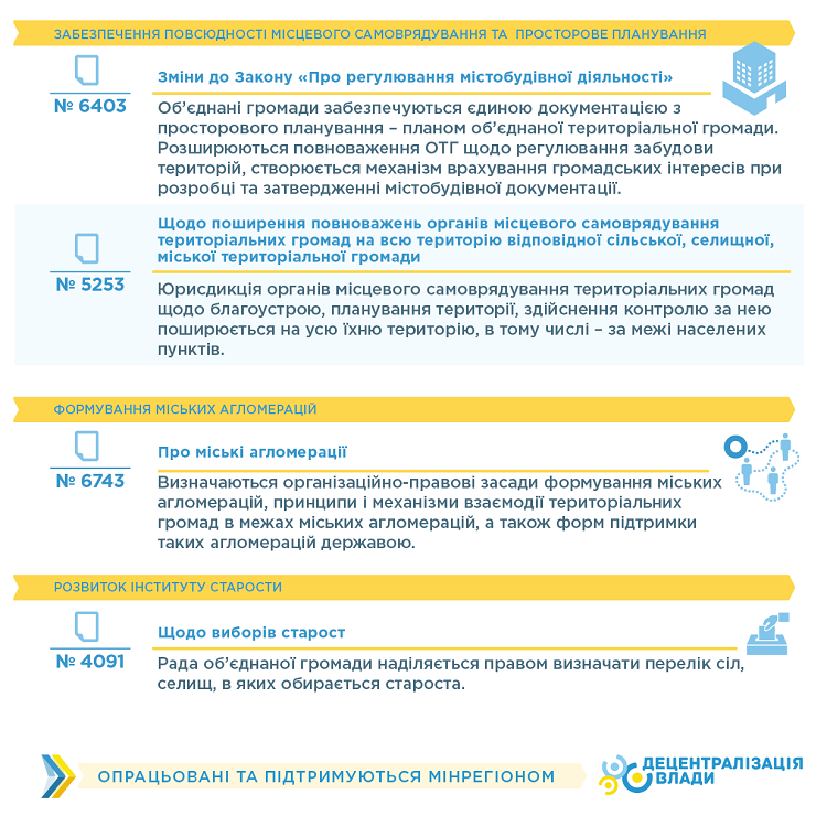 №5253 «Про внесення змін до деяких законодавчих актів України щодо поширення повноважень органів місцевого самоврядування територіальних громад на всю територію відповідної сільської, селищної, міської територіальної громади». Органи місцевого самоврядування мають повноваження щодо проведення благоустрою, планування території, здійснення контролю за територією виключно у межах населених пунктів. Законопроект поширює юрисдикцію органів місцевого самоврядування територіальних громад сіл, селищ, міст поза межами населених пунктів.