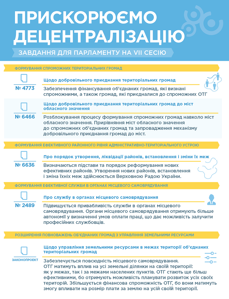 №6466 «Про внесення змін до Закону України «Про добровільне об’єднання територіальних громад» щодо добровільного приєднання територіальних громад сіл, селищ до територіальних громад міст обласного значення». Розблокує процес формування спроможних територіальних громад навколо міст обласного значення. Прирівняє територіальні громади міст обласного значення до спроможних об’єднаних територіальних громад та запровадить механізм добровільного приєднання громад до міст.