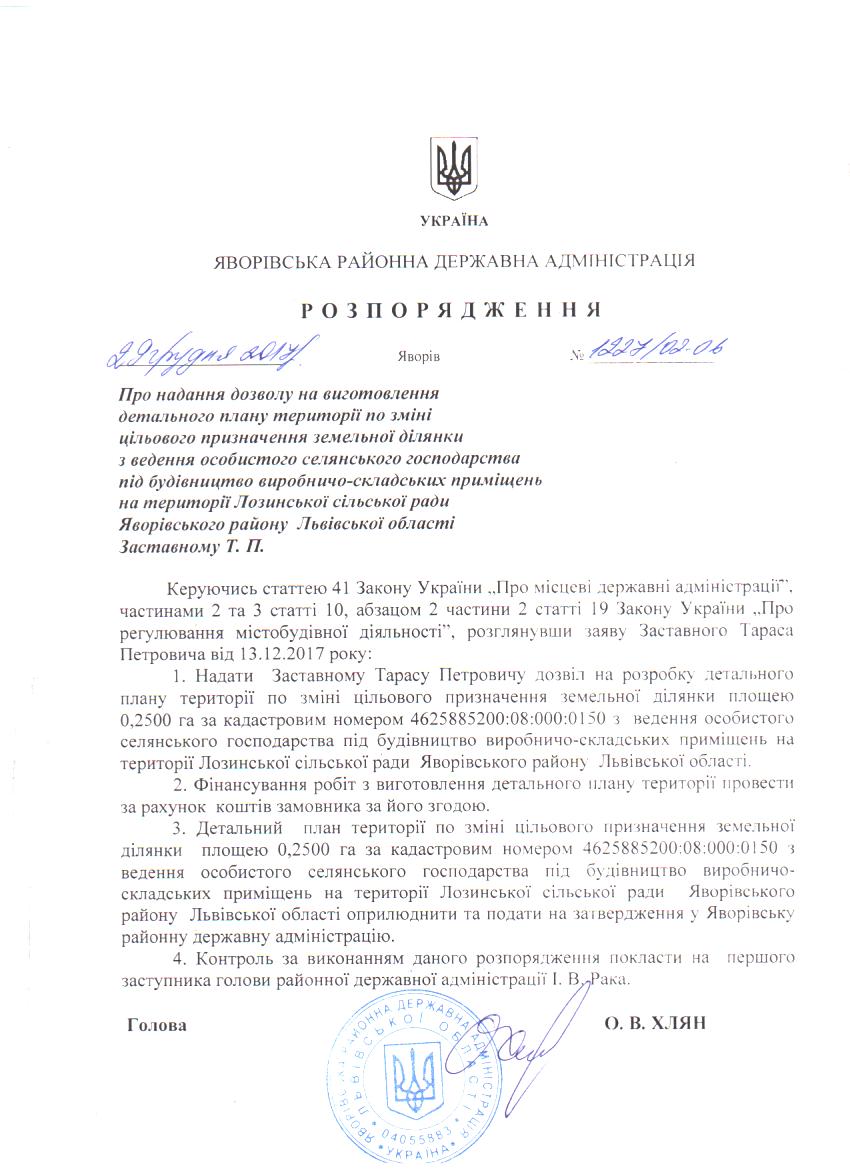 Про надання дозволу на виготовлення детального плану території по зміні цільового призначення земельної ділянки з ведення особистого селянського господарства під будівництва виробничо-складських приміщень на території Лозинської сільської ради Яворівського району Львівської області Заставному Т. П. |