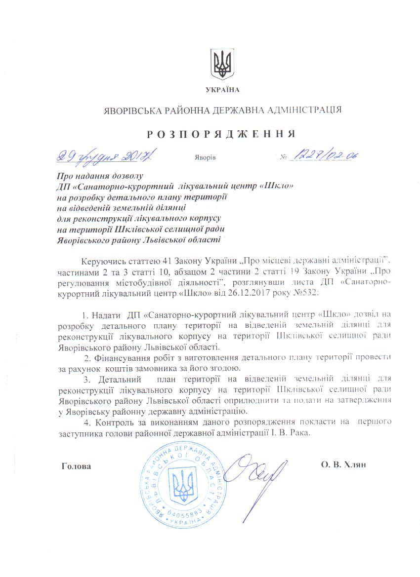 Про надання дозволу ДП "Санаторно-курортний лікувальний центр "Шкло" на розробку детального плану території на відведеній земельній ділянці для реконструкції лікувального корпусу на території Шклівської селищної ради Яворівського району Львівської області |
