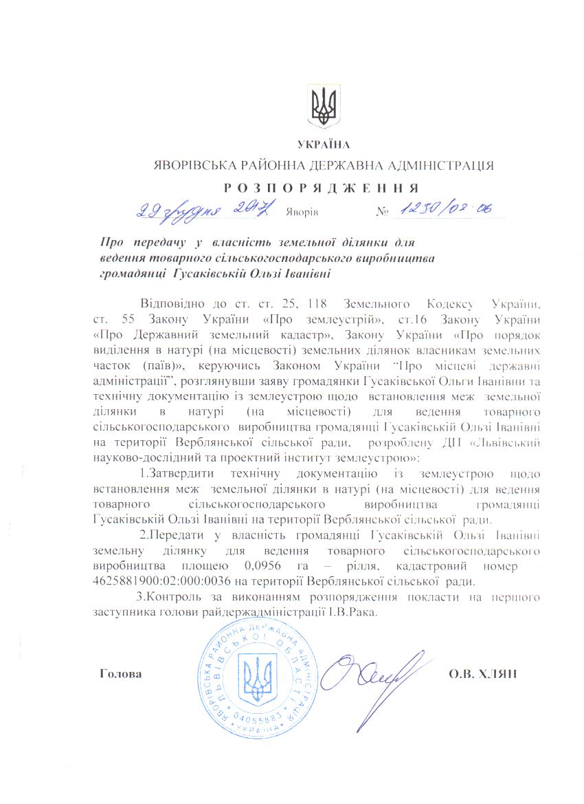 Про передачу у власність земельної ділянки для ведення товарного сільськогосподарського виробництва громадянці Гусаківській Ользі Іванівні |