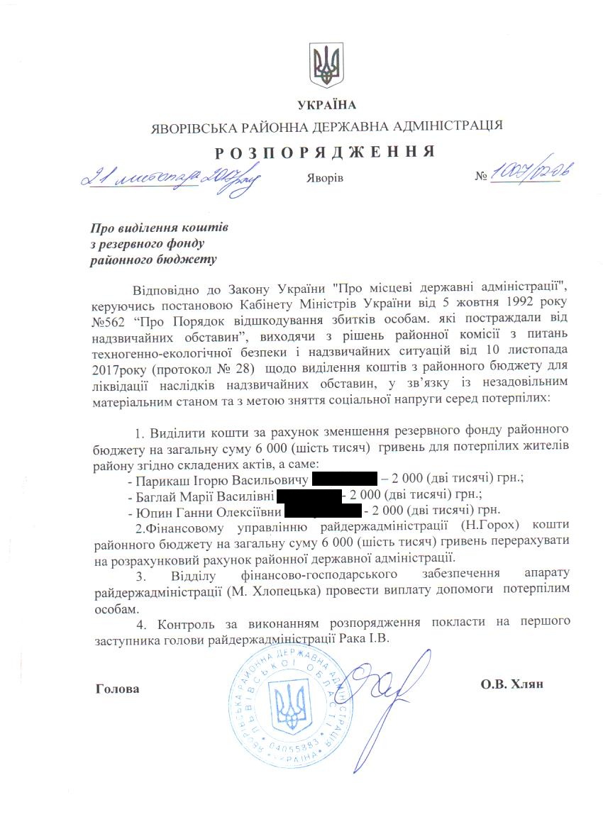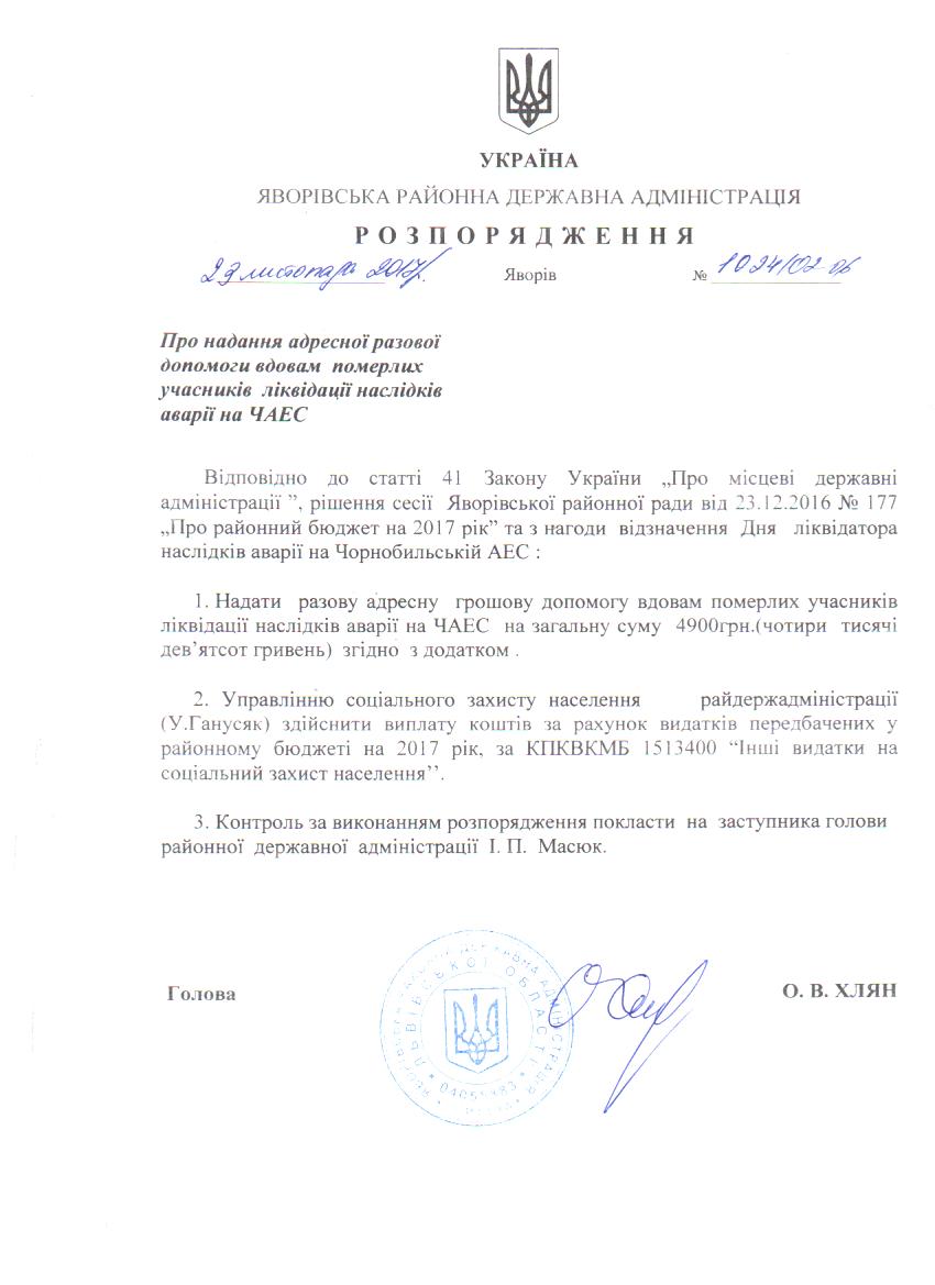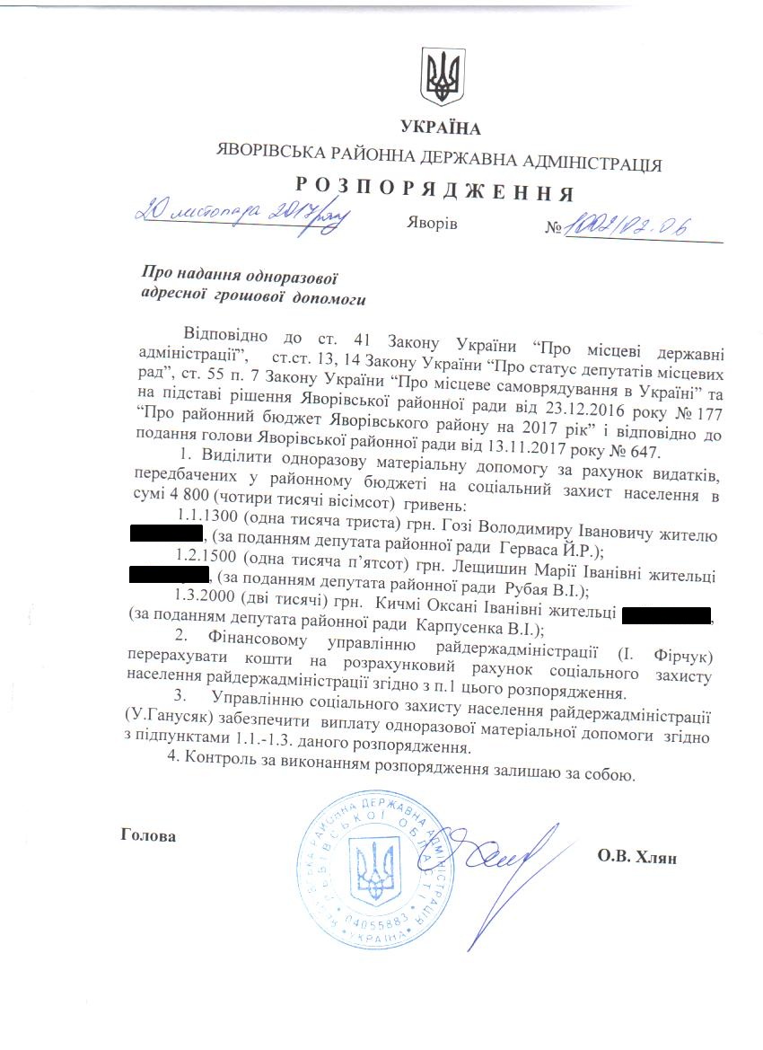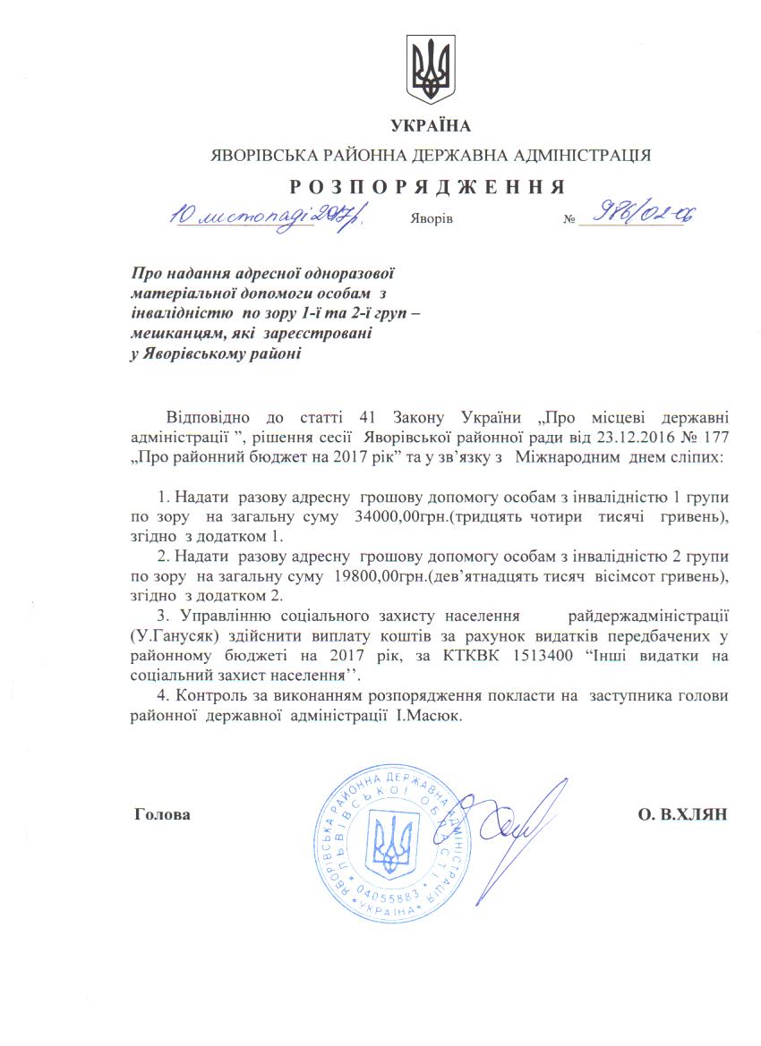 Про надання адресної одноразової матеріальної допомоги особам з інвалідністю по зору 1-ї та 2-ї груп - мешканцям, які зареєстровані у Яворівському районі |