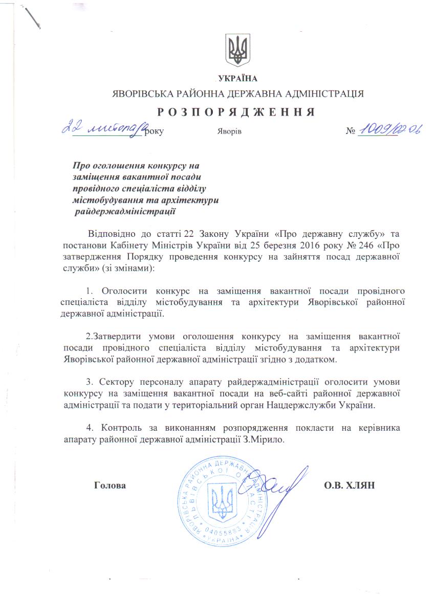 Про оголошення конкурсу на заміщення вакантної посади провідного спеціаліста відділу містобудування та архітектури райдержадміністрації |