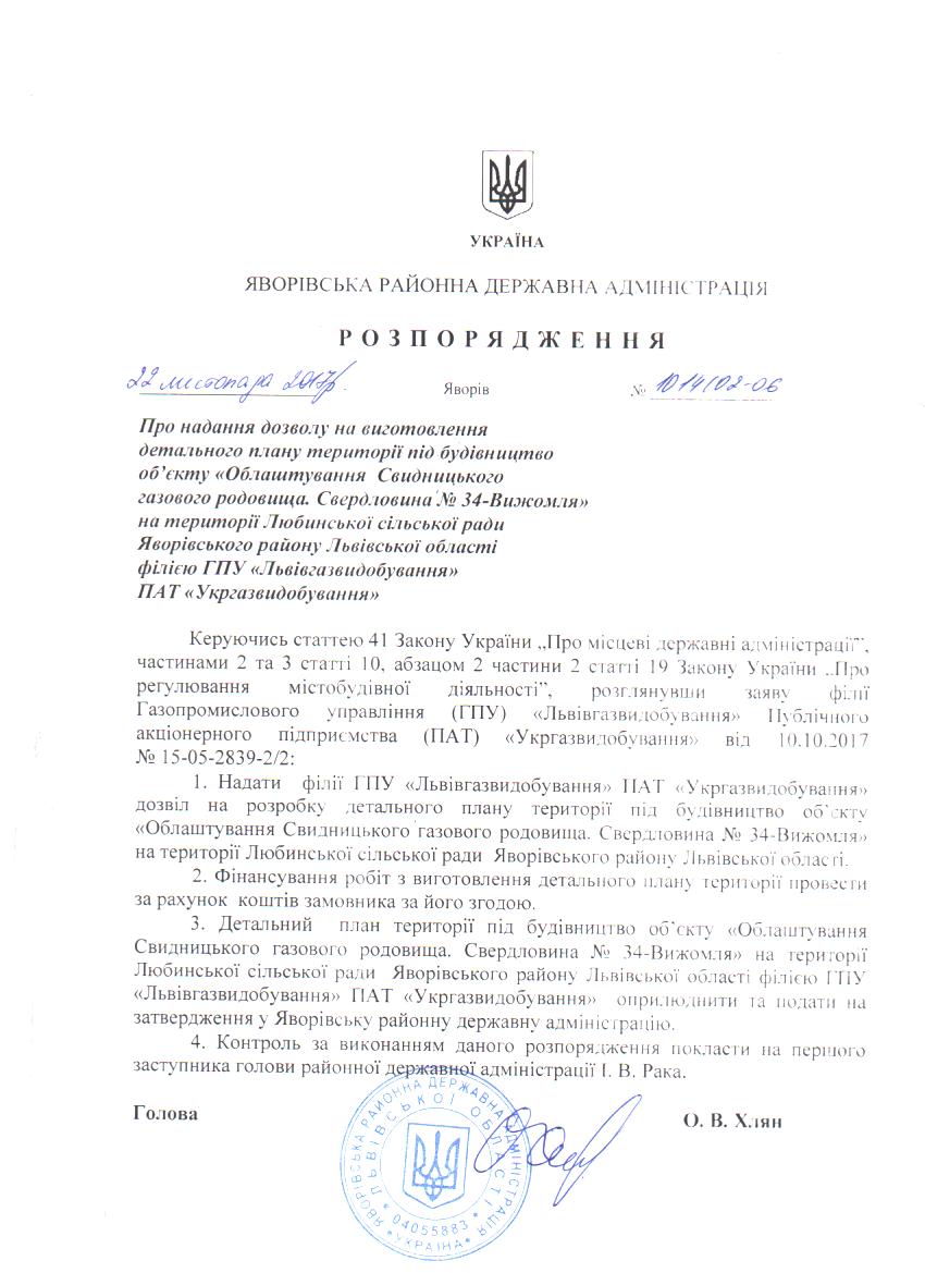 Про надання дозволу на виготовлення детального плану території під будівництво об'єкту "Облаштування Свидницького газового родовища. Свердловина №34 Вижомля" на території Любинської сільської ради Яворівського району Львівської області філією ГПУ "Львівгазвидобування" ПАТ "Укргазвидобування" |