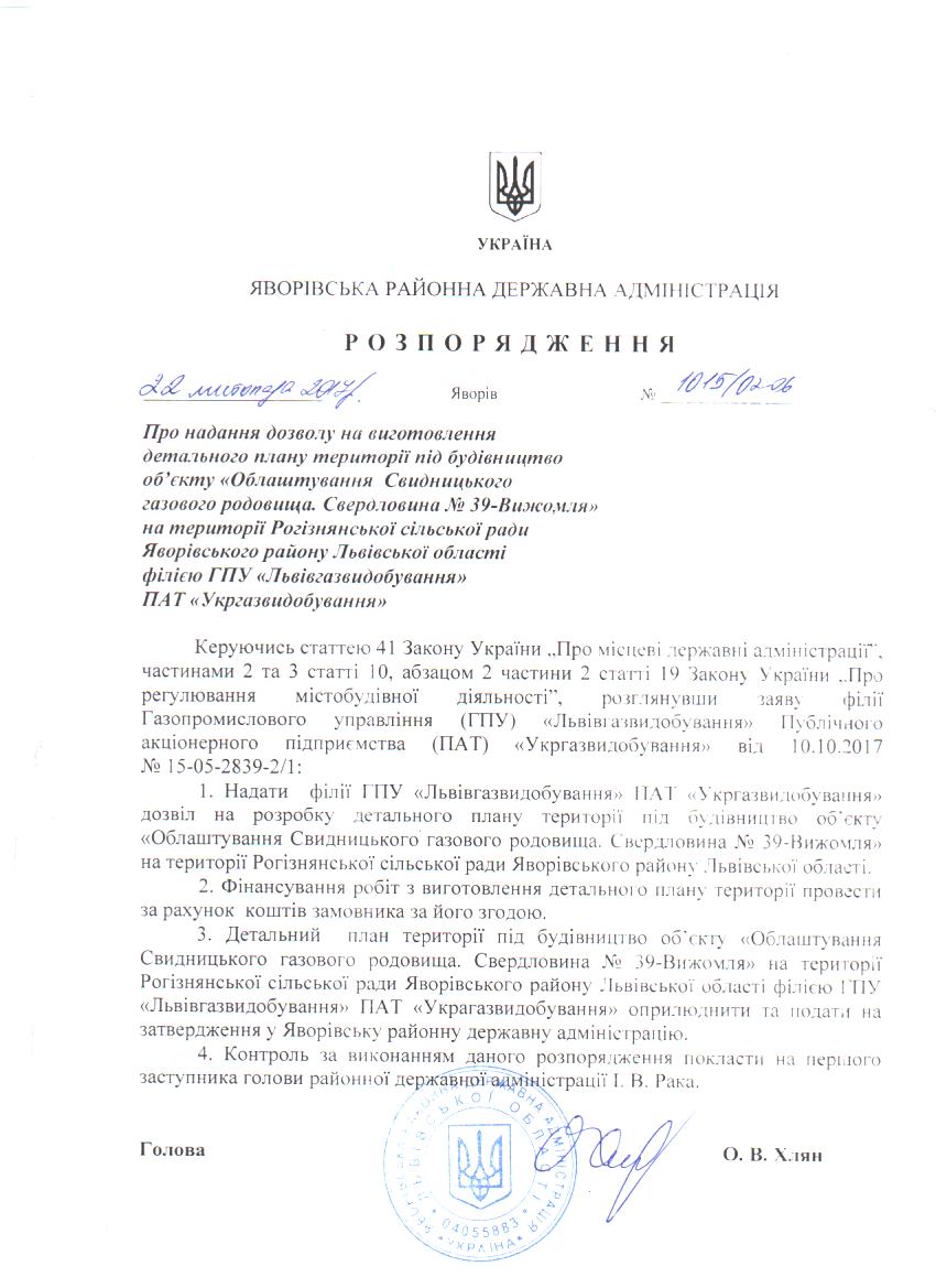 Про надання дозволу на виготовлення детального плану території під будівництво об'єкту "Облаштування Свидницького газового родовища. Свердловина №39-Вижомля" на території Рогізненської сільської ради Яворівської району Львівської області філією ГПУ "Львівгазвидобування" ПАТ "Укргазвидобування" |