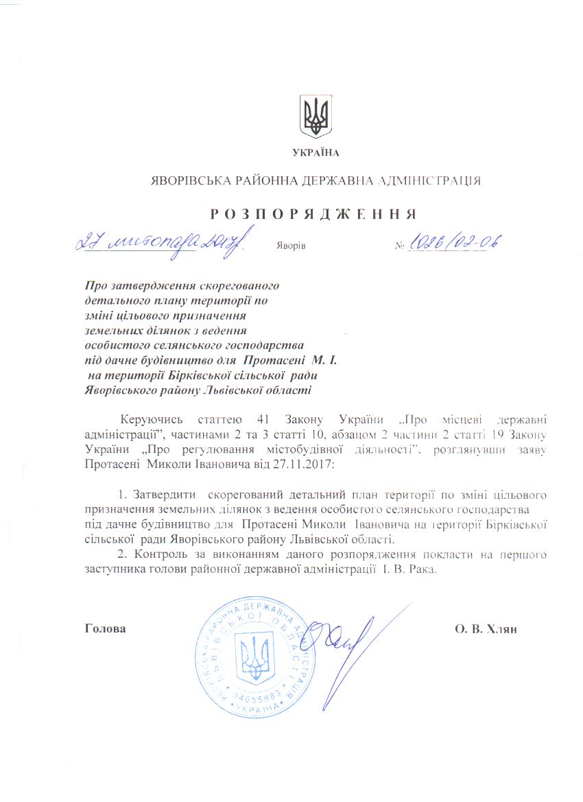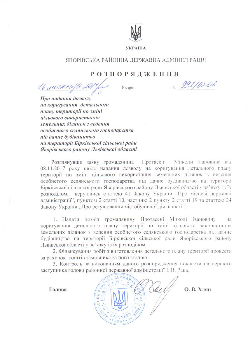 Про затвердження детального плану території по зміні цільового призначення земельних ділянок для ведення особистого селянського господарства під дачне будівництво для Протасені М. І. на території Бірківської сільської ради Яворівського району Львівської області |