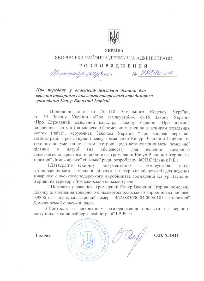 Про передачу у власність земельної ділянки для ведення товарного сільськогосподарського виробництва громадянці Качур Василині Ігорівні |