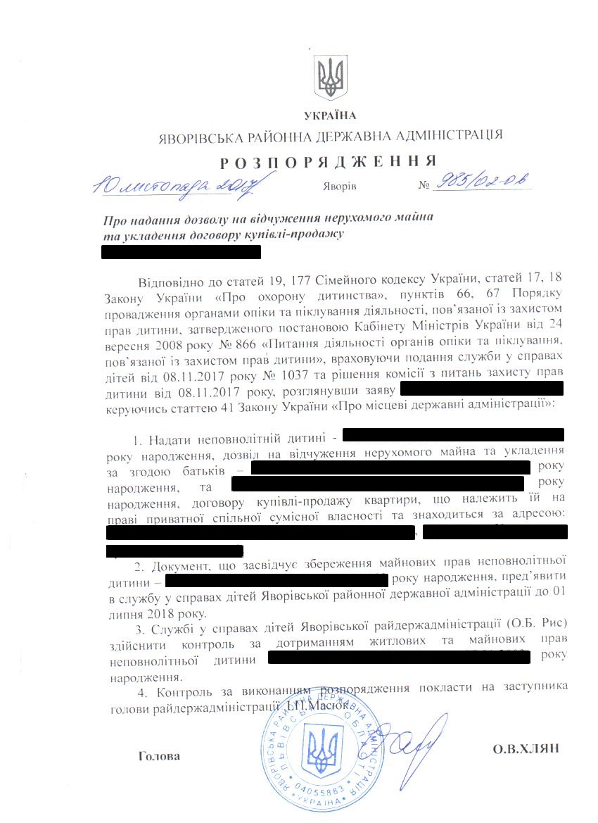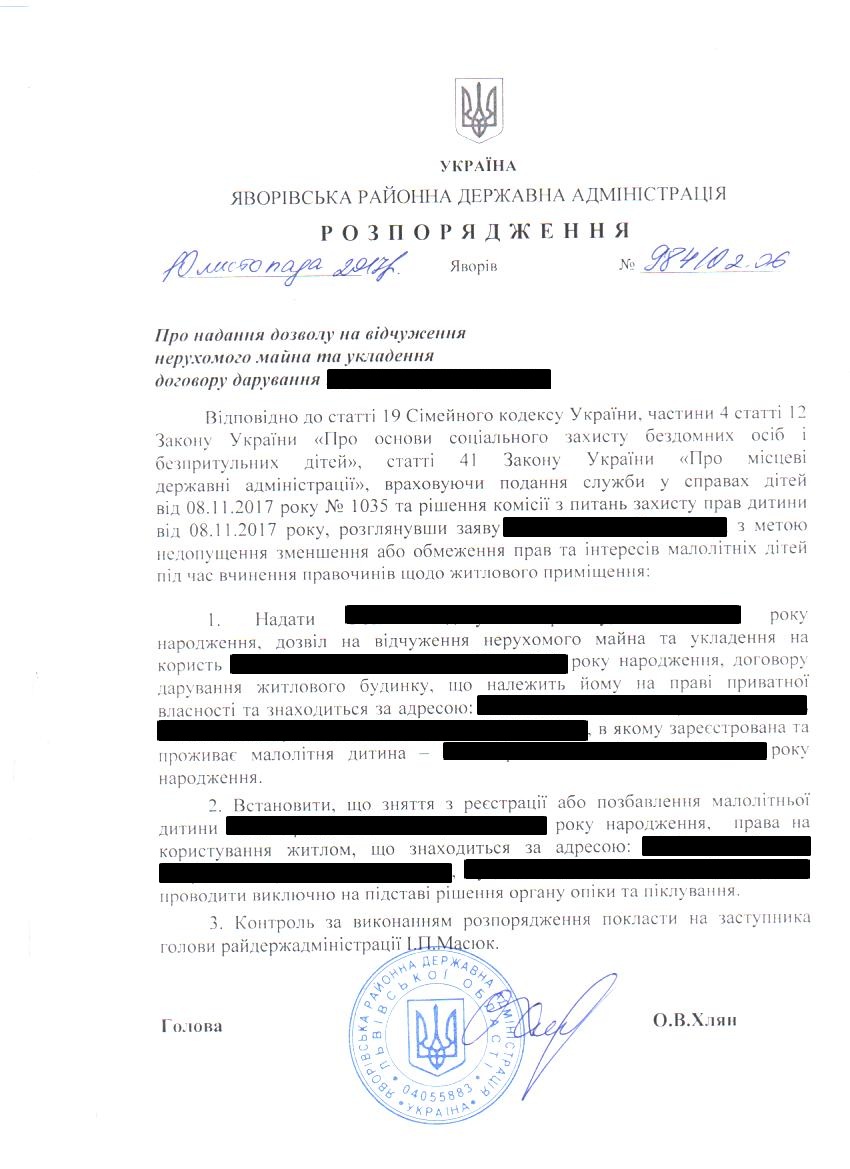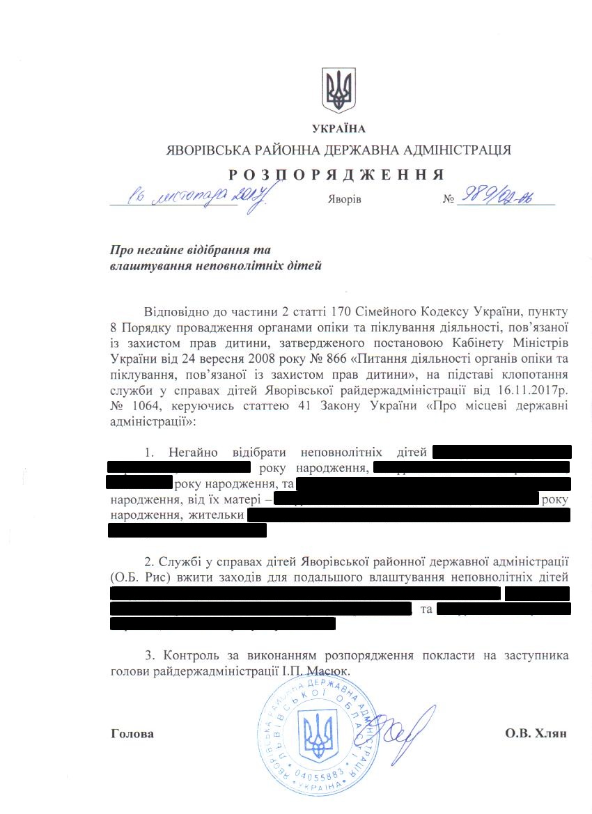 Про негайне відібрання та влаштування неповнолітніх дітей |