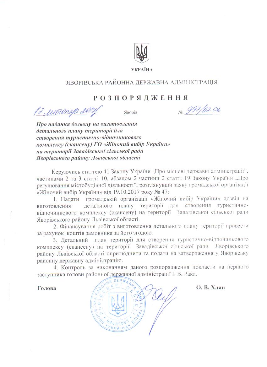 Про надання дозволу на виготовлення детального плану території для створення туристично-відпочинкового комплексу (скансену) ГО "Жіночий вибір України" на території Завадівської сільської ради Яворівського району Львівської області |