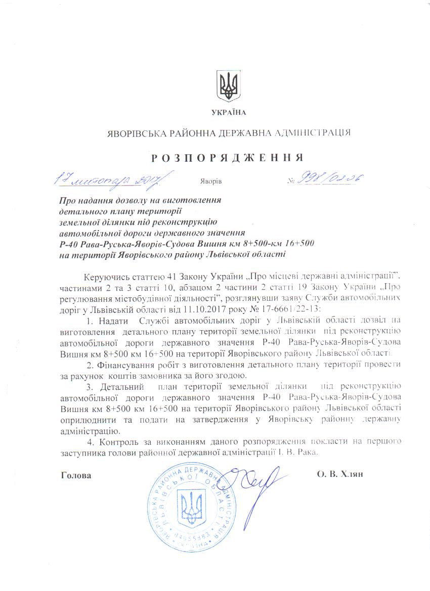 Про надання дозволу на виготовлення детального плану території земельної ділянки під реконструкцію автомобільної дороги державного значення Р-40 Рава-Руська-Яворів-Судова Вишня км 8+500 км 16+500 на території Яворівського району Львівської області |