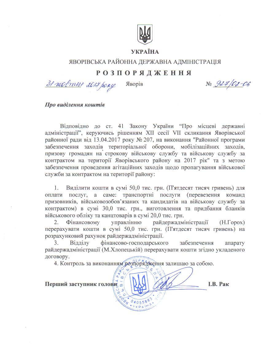 №927/02-06 2017-11-03 Про виділення коштів