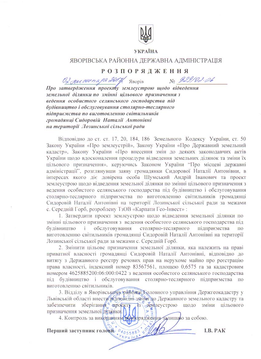 №929/02-06 2017-11-07 Про затвердження проекту землеустрою щодо відведення земельної ділянки по зміні цільового призначення з ведення особистого селянського господарства під будівництво і обслуговування столярно-теслярного підприємства по виготовленню світильників громадянці Сидоровій Наталії Антонівні на території Лозинської сільської ради
