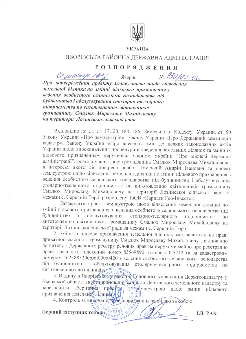 №930/02-06 2017-11-07 Про затвердження проекту землеустрою щодо відведення земельної ділянки по зміні цільового призначення з ведення особистого селянського господарства під будівництво і обслуговування столярно-теслярного підприємства по виготовленню світильників громадянину Смалюх Мирославу Михайловичу на території Лозинської сільської ради
