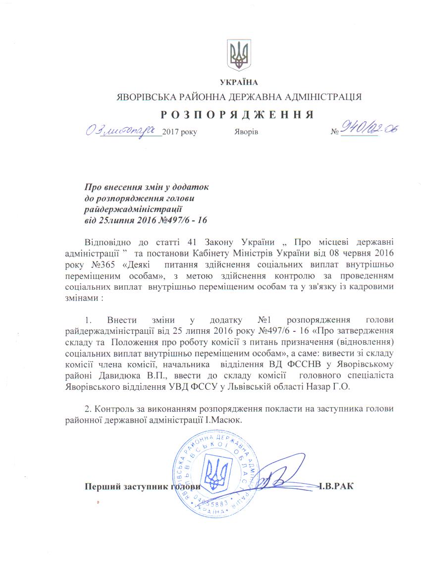 №940/02-06 2017-11-08 Про внесення змін у додаток до розпорядження голови райдержадміністрації від 25 липня 2016 р. №497/6-16