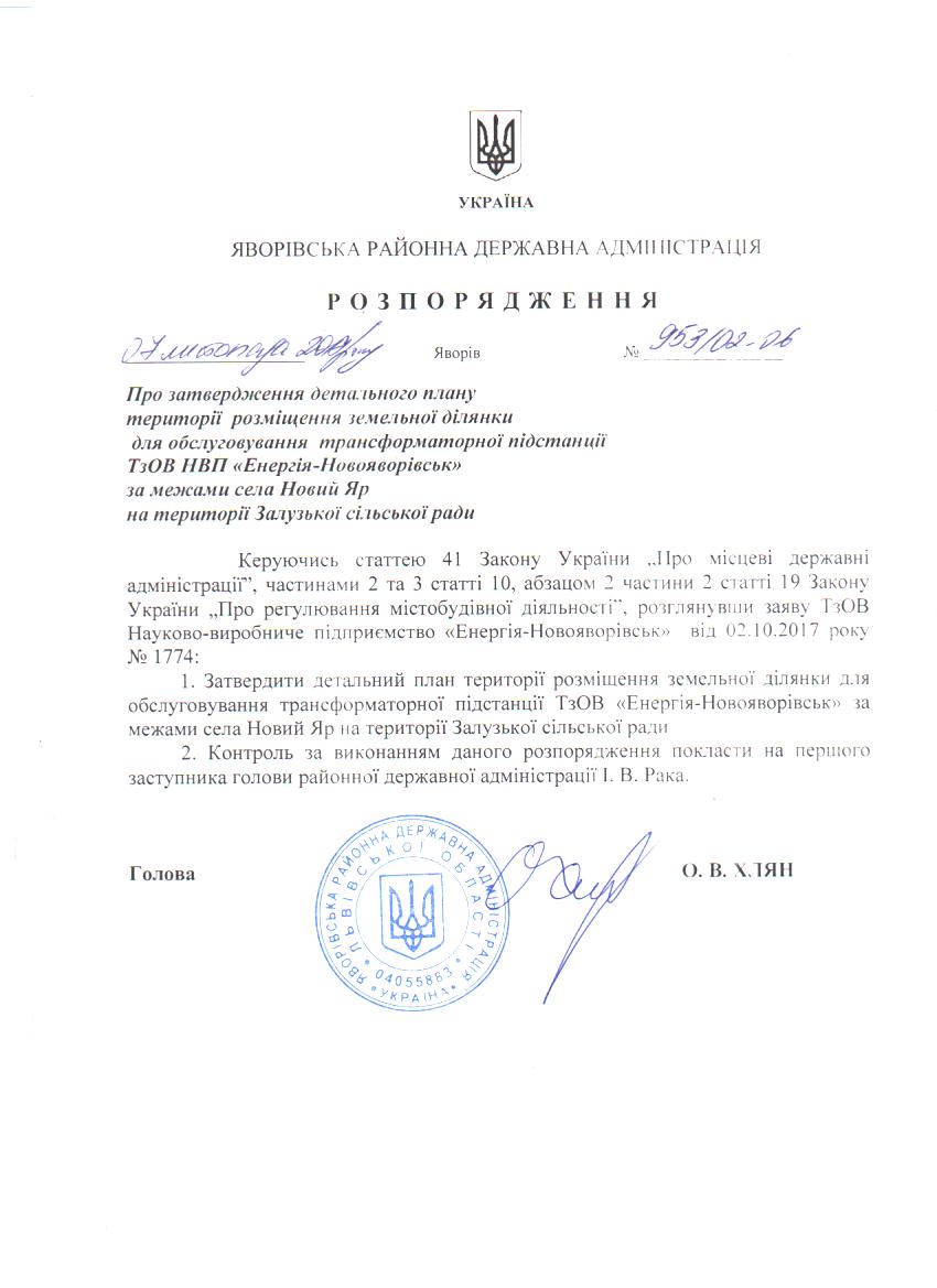 №953/02-06 2017-11-10 Про затвердження детального плану території розміщення земельної ділянки для обслуговування трансформаторної підстанції ТзОВ НВП "Енергія-Новояворівськ" за межами села Новий Яр на території Залузької сільської ради