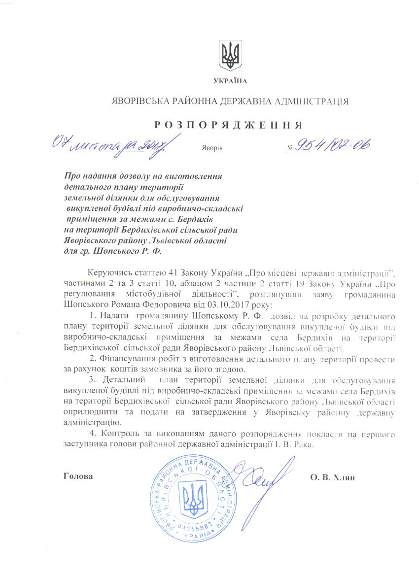 №954/02-06 2017-11-10 Про надання дозволу на виготовлення детального плану території земельної ділянки для обслуговування викупленої будівлі під виробничо-складські приміщення за межами с. Бердихів на території Бердихівської сільської ради Яворівського району Львівської області для гр. Шопського Р. Ф.