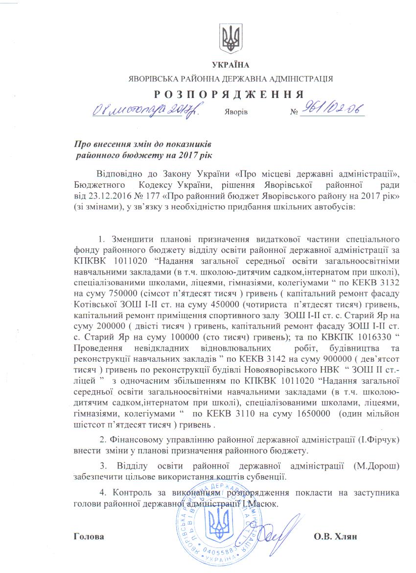 №961/02-06 2017-11-13 Про внесення змін до показників районного бюджету на 2017 рік