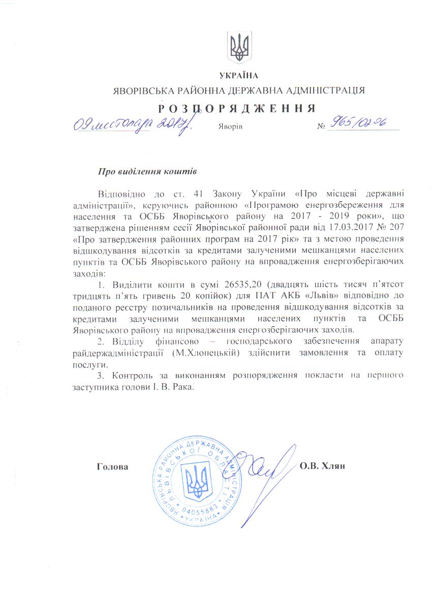 №965/02-06 2017-11-15 Про виділення коштів