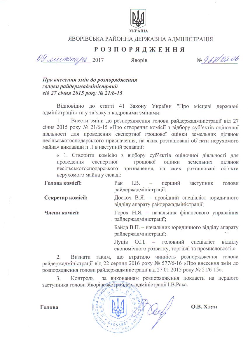 №968/02-06 2017-11-15 Про внесення змін до розпорядження голови райдержадміністрації від 27 січня 2015 року №21/6-15