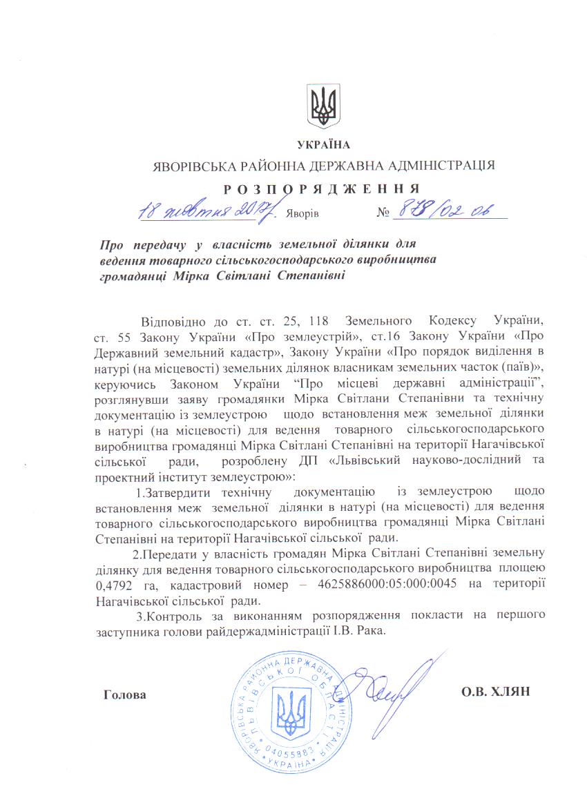 Про передачу у власність земельної ділянки для ведення товарного сільськогосподарського виробництва громадянці Мірка Світлані Степанівні |