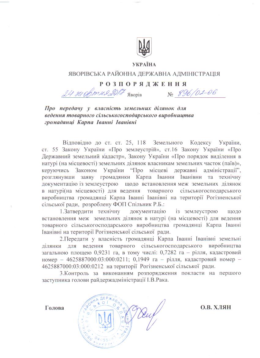 Про передачу у власність земельних ділянок для ведення товарного сільськогосподарського виродництва громадянці Карпа Іванні Іванівні |