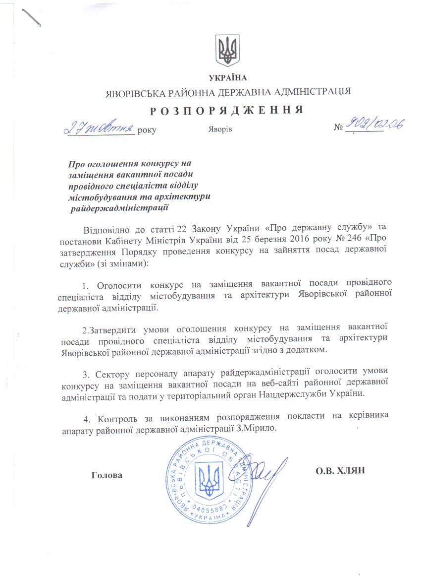 Про оголошення конкурсу на заміщення вакантної посади провідного спеціаліста відділу містобудування та архітектури райдержадміністрації |