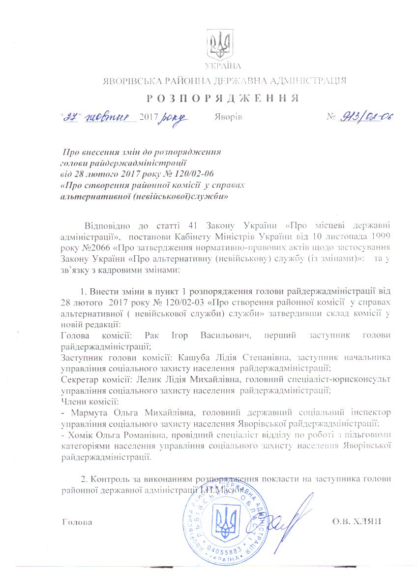 Про внесення змін до розпорядження голови райдержадміністрації від 28 лютого 2017 року №120/02-06 "Про створення районної комісії у справах альтернативної (невійськової) служби" |