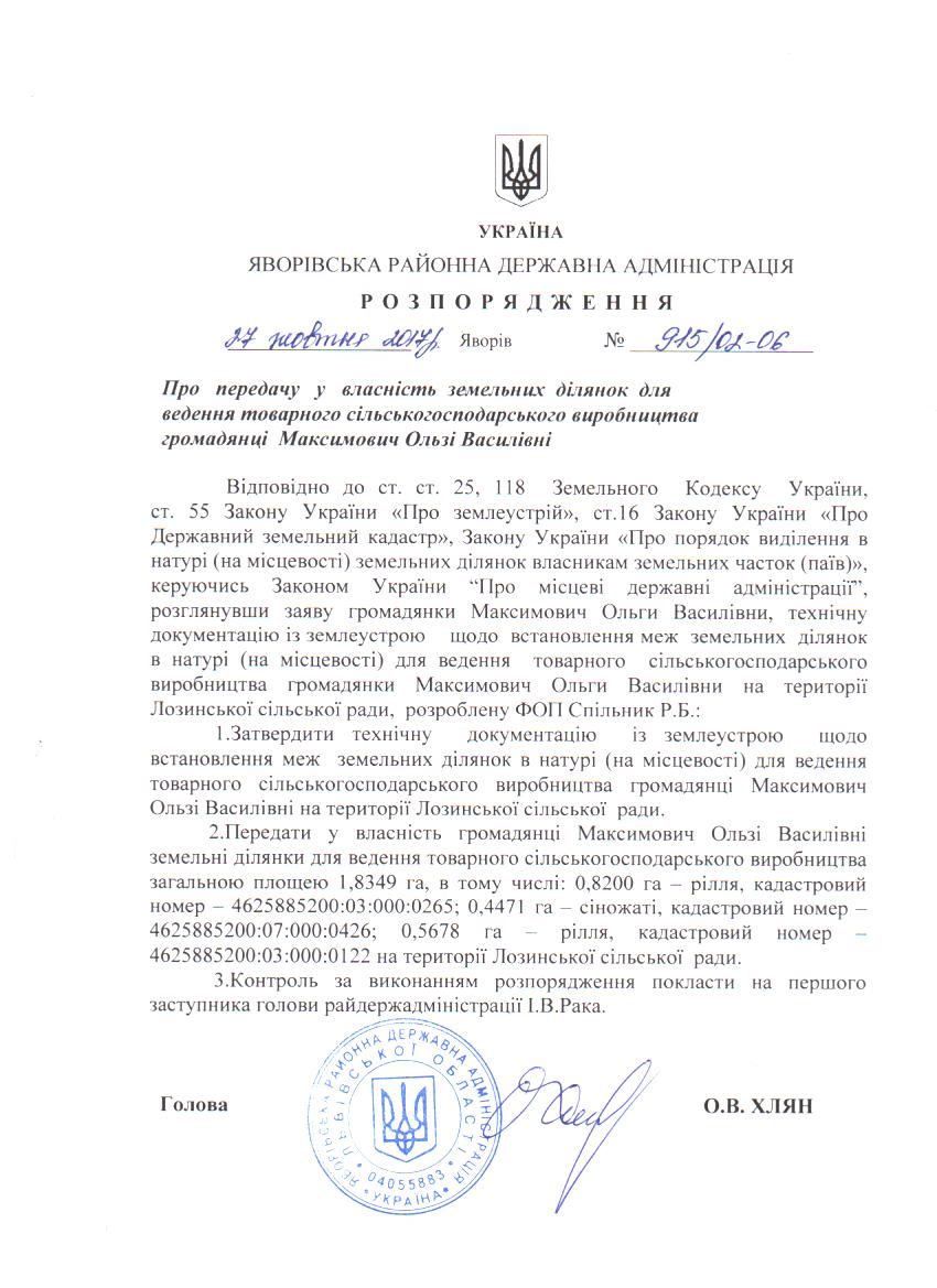 Про передачу у власність земельних ділянок для ведення товарного сільськогосподарського виробництва громадянці Максимович Ользі Василівні |