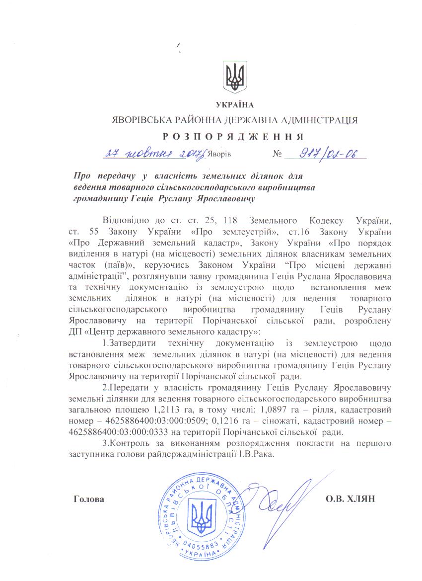 Про передачу у власність земельних ділянок для ведення товарного сільськогосподарського виробництва громадянину Геців Руслану Ярославовичу |