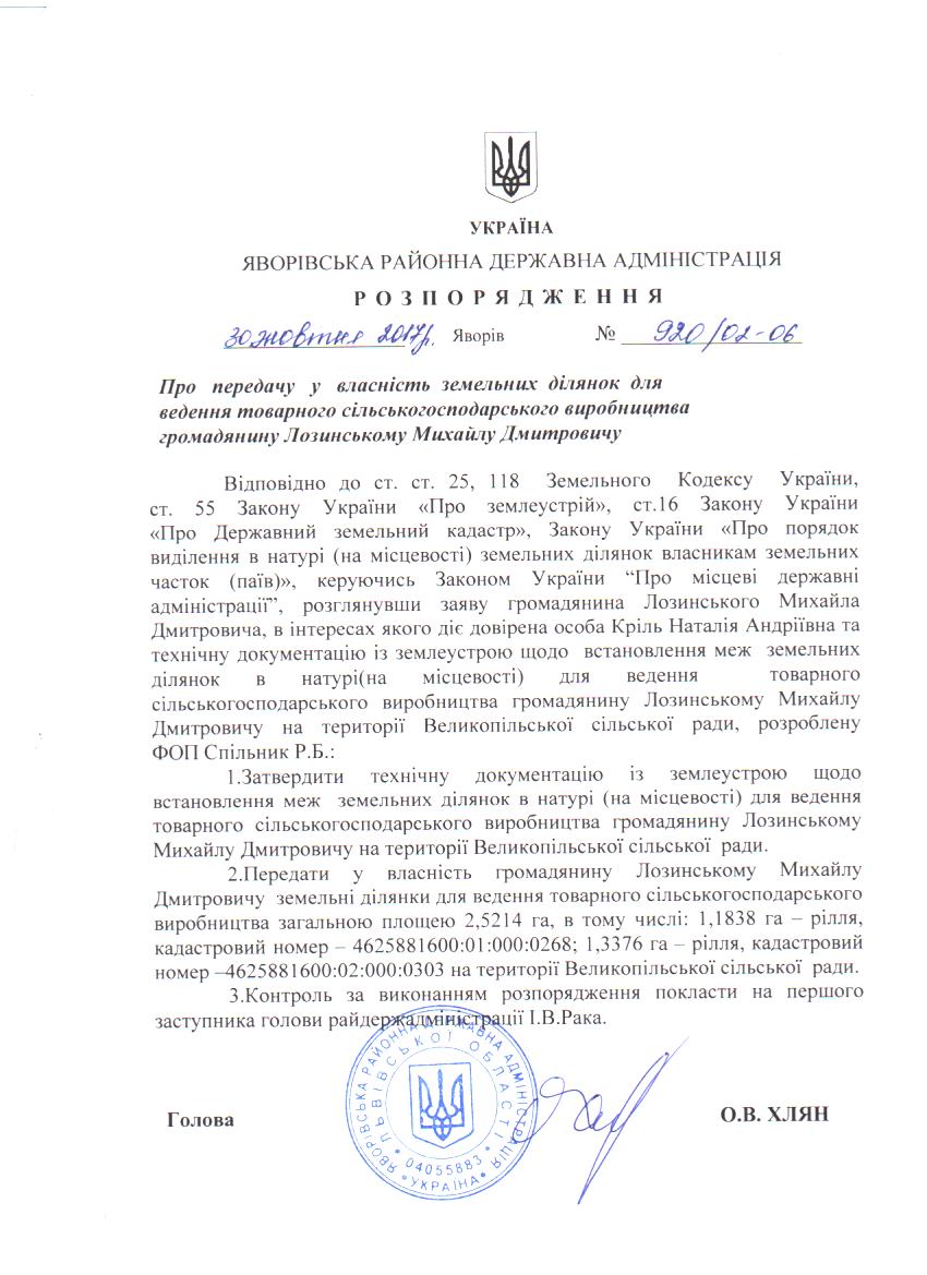 Про передачу у власність земельних ділянок для ведення товарного сільськогосподарського виробництва громадянину Лозинському Михайлу Дмитровичу |