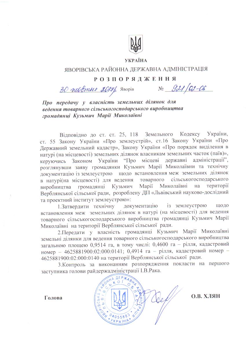 Про передачу у власність земельних ділянок для ведення товарного сільськогосподарського виробництва громадянці Кузьмич Марії Миколаївні |