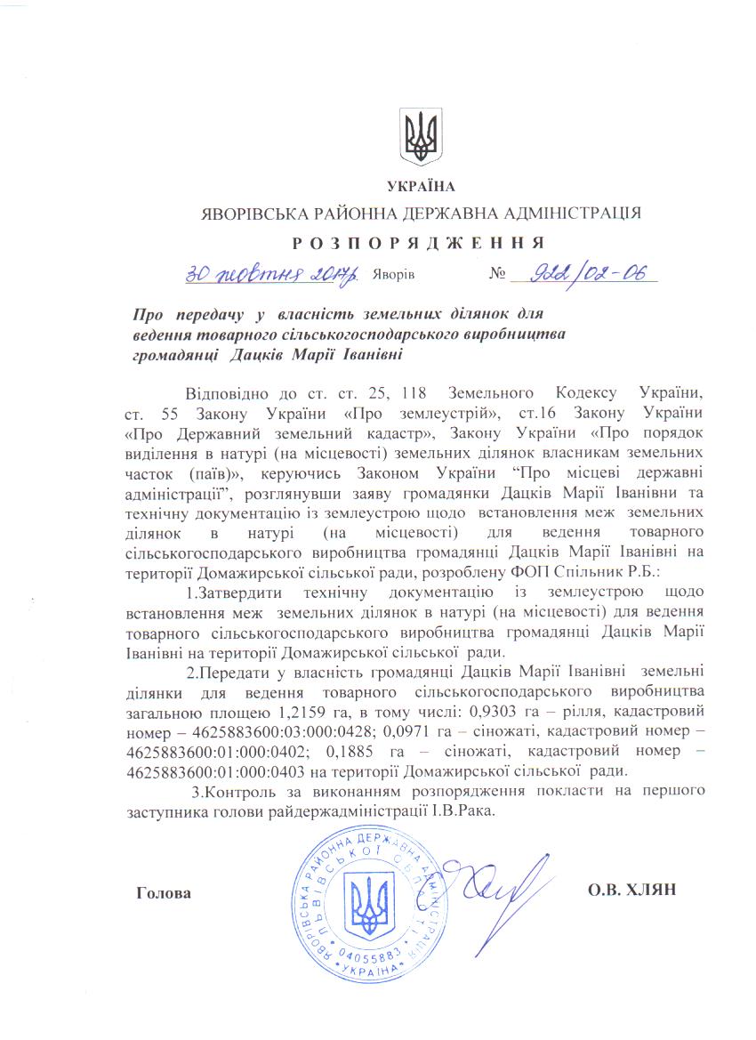 Про передачу у власність земельних ділянок для ведення товарного сільськогосподарського виробництва громадянці Дацків Марії Іванівні |