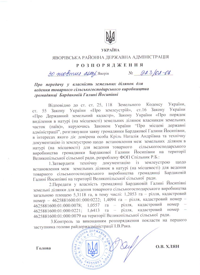 Про передачу у власність земельних ділянок для ведення товарного сільськогосподарського виробництва громадянці Бардаковій Галині Йосипівні |