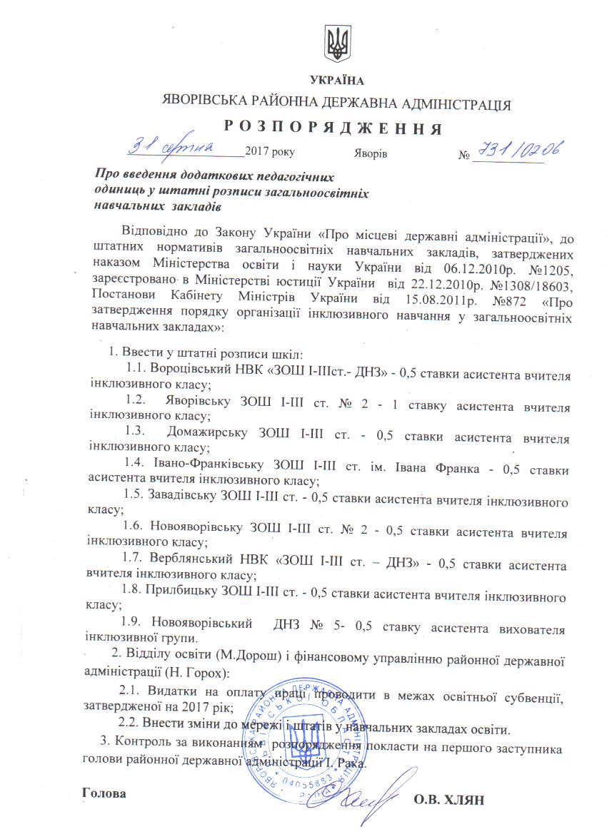 731/02-06 2017-09-05 Про введення додаткових педагогічних одиниць в штатні розписи загальноосвітніх навчальних закладів