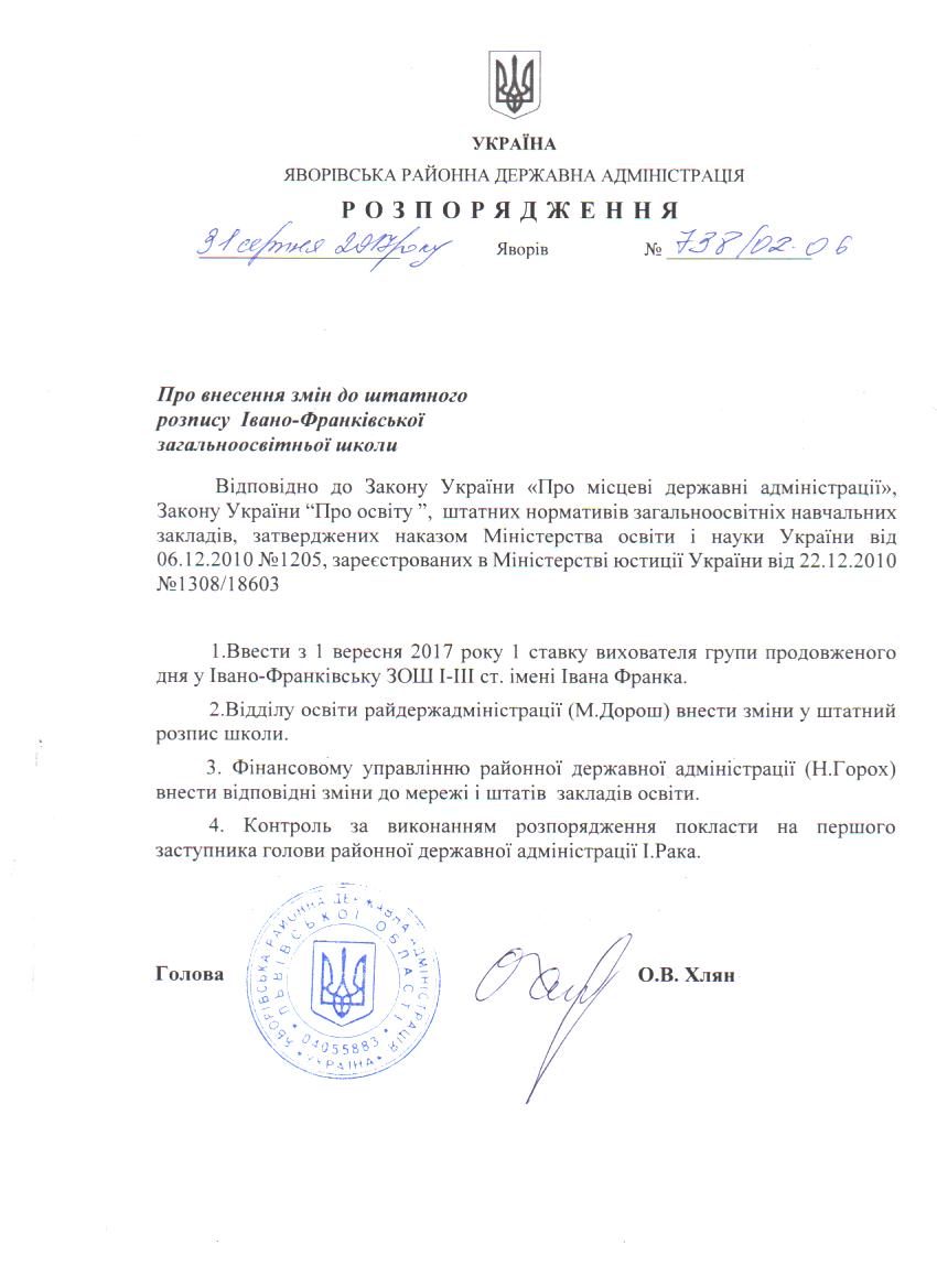 738/02-06 2017-09-05 Про внесення змін до штатного розпису Івано-Франківської загальноосвітньої школи