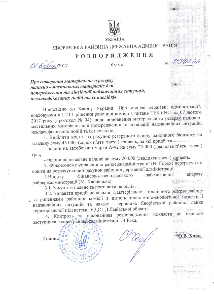 739/02-06 2017-09-07 Про створення матеріального резерву паливно-мастильних матеріалів для попередження та ліквідації надзвичайних ситуацій, некласифікових подій та їх наслідків