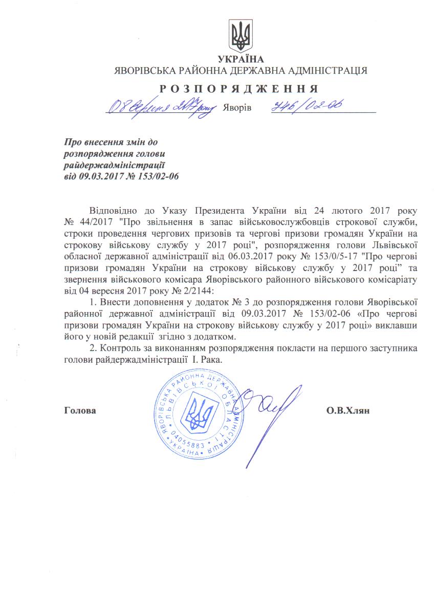 773/02-06 2017-09-22 Про підготовку та проведення приписки громадян України до призовної дільниці Яворівського району у 2018 році