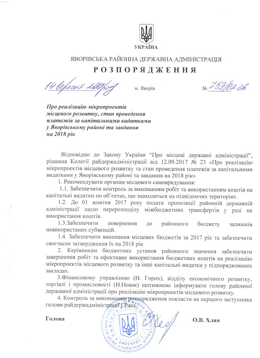 759/02-06 2017-09-21 Про реалізацію мікропроектів місцевого розвитку, стан проведення платежів за капітальними видатками у Яворівському районі та завдання на 2018 рік