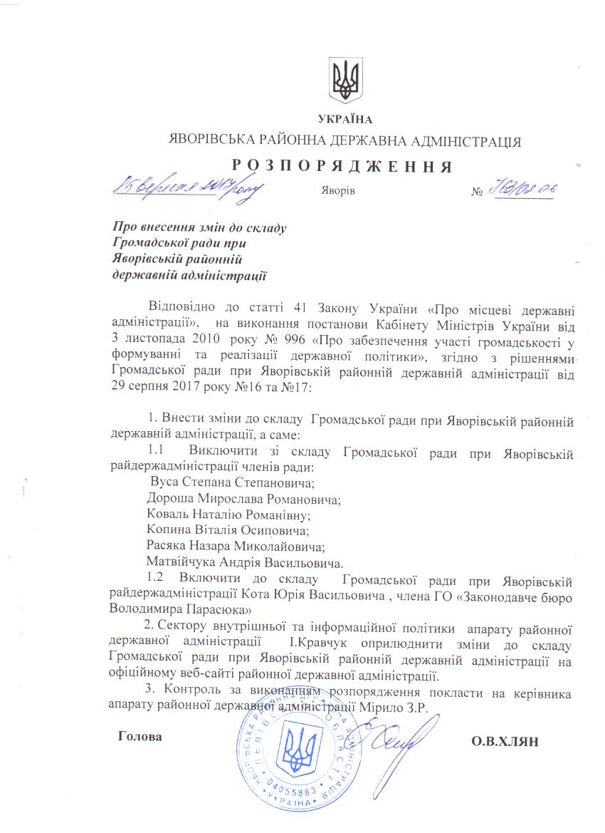 763/02-06 2017-09-22 Про внесення змін до складу Громадської ради при Яворівській районній державній адміністрації