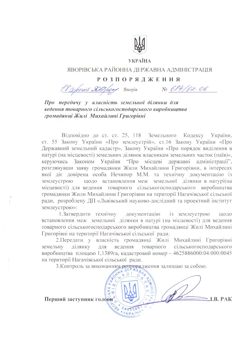 Про передачу у власність земельної ділянки для ведення товарного сільськогосподарського виробництва громадянці Жилі Михайлині Григорівні |