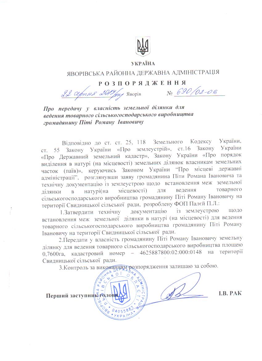 Про передачу у власність земельної ділянки для ведення товарного сільськогосподарського виробництва громадянину Піті Роману Івановичу |