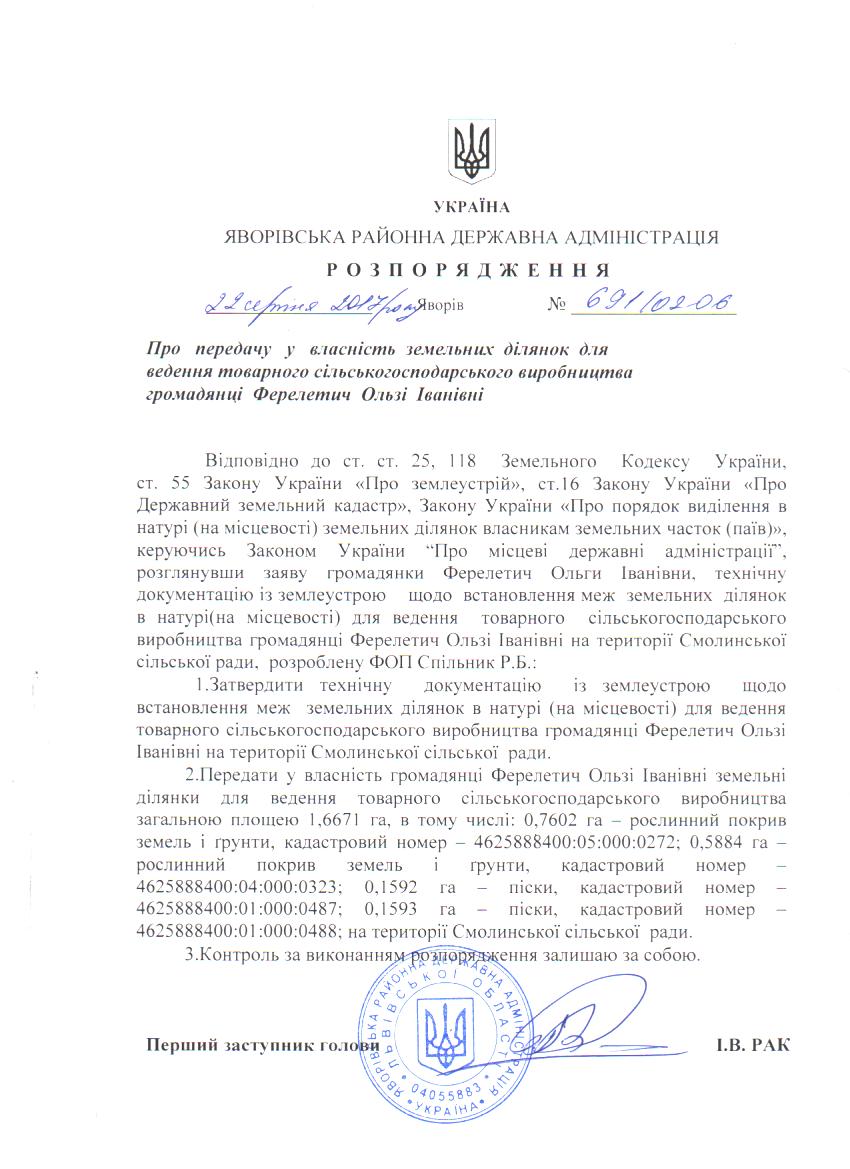 Про передачу у власність земельних ділянок для ведення товарного сільськогосподарського виробництва громадянці Ферелетич Ользі Іванівні |