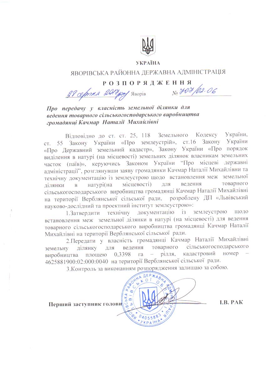 Про передачу у власність земельної ділянки для ведення товарного сільськогосподарського виробництва громадянці Качмар Наталії Михайлівні |