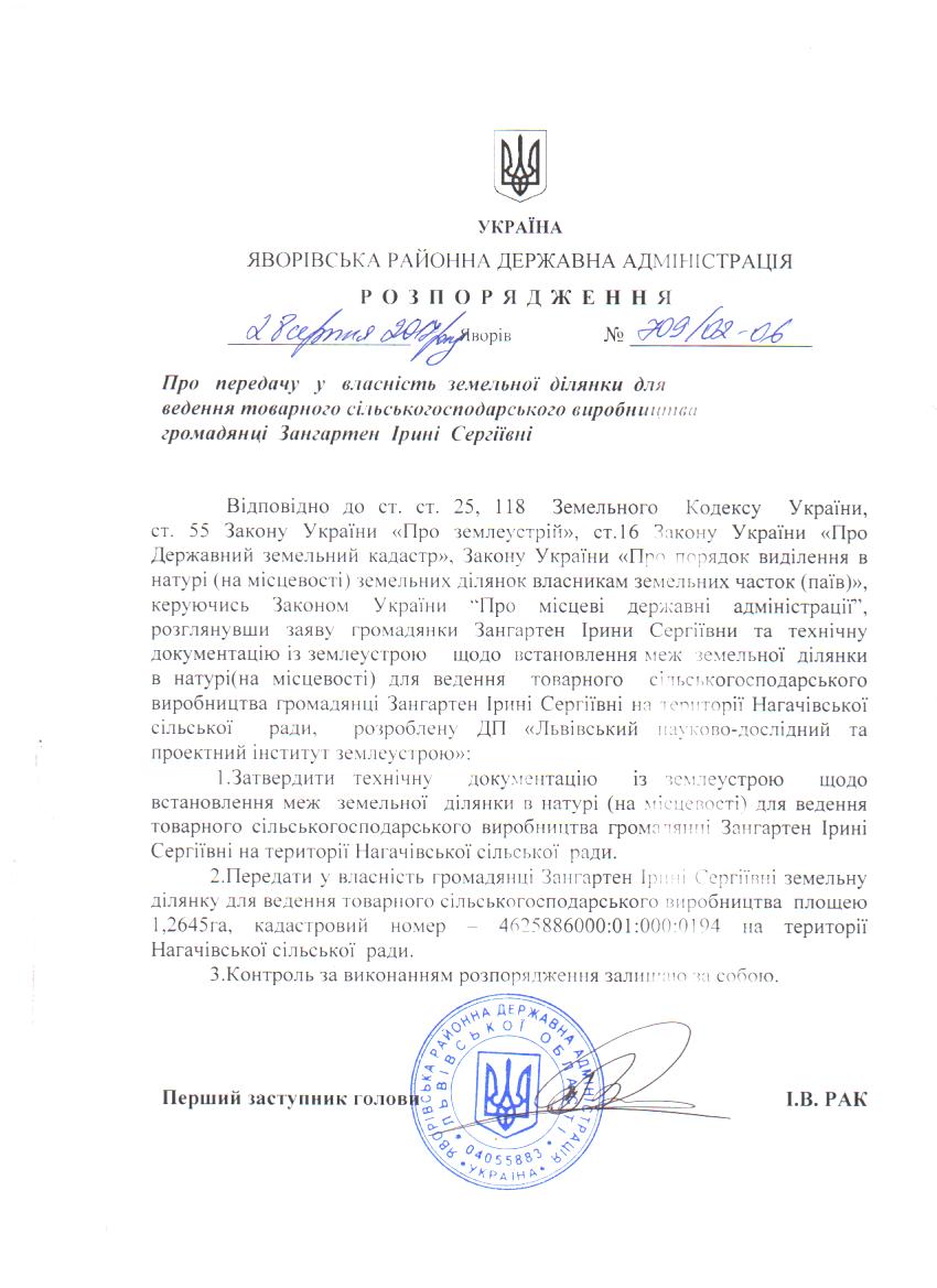 Про передачу у власність земельної ділянки для ведення товарного сільськогосподарського виробництва громадянці Зангартен Ірині Сергіївні |