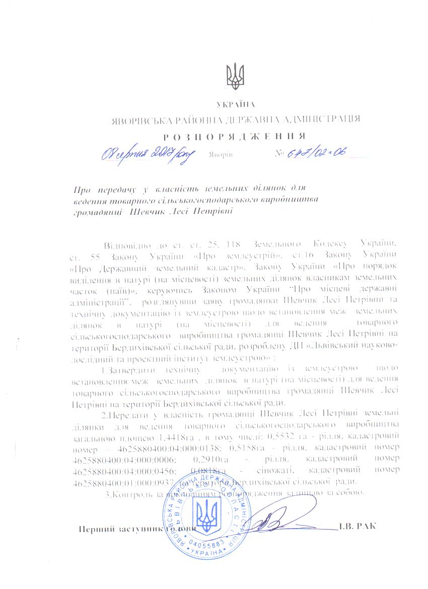 647/02-06 2017-08-11 Про передачу у власність земельних ділянок для ведення товарного сільськогосподарського виробництва громадянці Шевчик Лесі Петрівні
