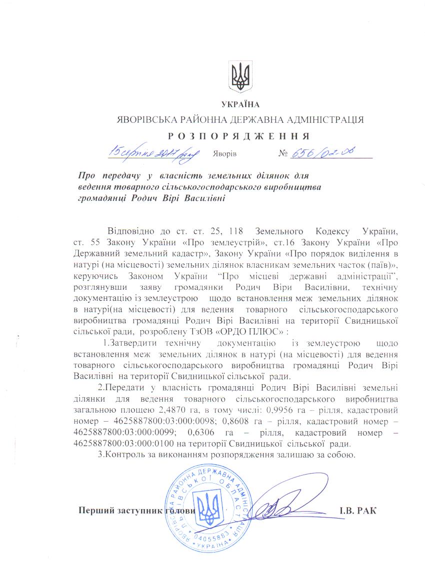 656/02-06 2017-08-18 Про передачу у власність земельної ділянки для ведення товарного сільськогосподарського виробництва громадянці Продич Вірі Василівні