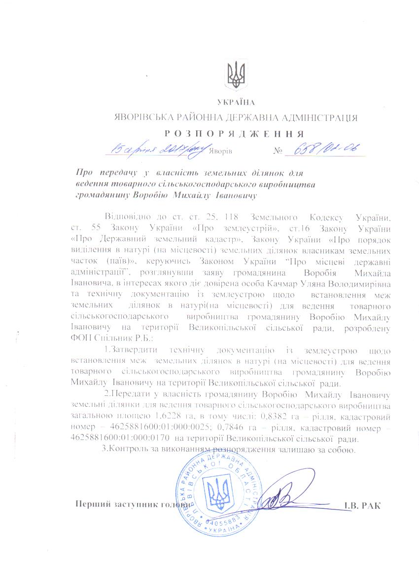 658/02-06 2017-08-18 Про передачу у власність земельних ділянок для ведення товарного сільськогосподарського виробництва громадянину Воробію Михайлу Івановичу